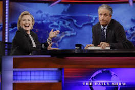 Democrats: 'Sign our thank you card for Jon Stewart' -- and then donate money to the party In this July 15, 2014, file photo, former U.S. Secretary of State Hillary Rodham Clinton reacts to host Jon Stewart during a taping of "The Daily Show ...