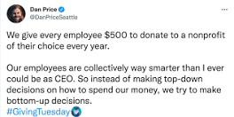 Dan Price is marking Giving Tuesday by putting donation money into the hands of his employees The Gravity Payments CEO announced on Twitter that every employee receives $500 dollars a year to donate to the nonprofit of their choice.